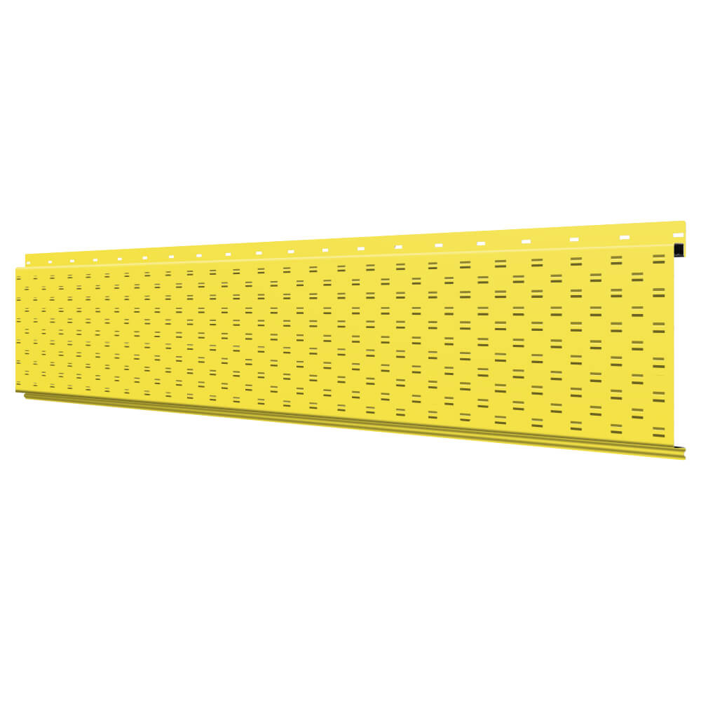 Линеарная потолочно-стеновая панель с ПЕРФОРАЦИЕЙ для вентиляции цвет RAL1018 Желтый применяется в качестве софитов для подшивы крыши, наружной и внутренней отделки потолков, стен, фронтонов фасада дома в Петропавловске-Камчатском.