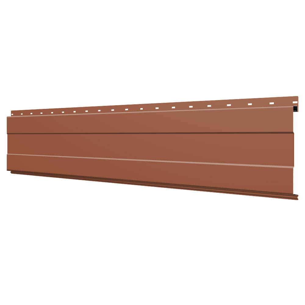 Линеарная потолочно-стеновая панель с ПОЛОСОЙ усиленная цвет RAL8004 Терракотовый применяется в качестве софитов для подшивы крыши, наружной и внутренней отделки потолков, стен, фронтонов фасада дома в Петропавловске-Камчатском.