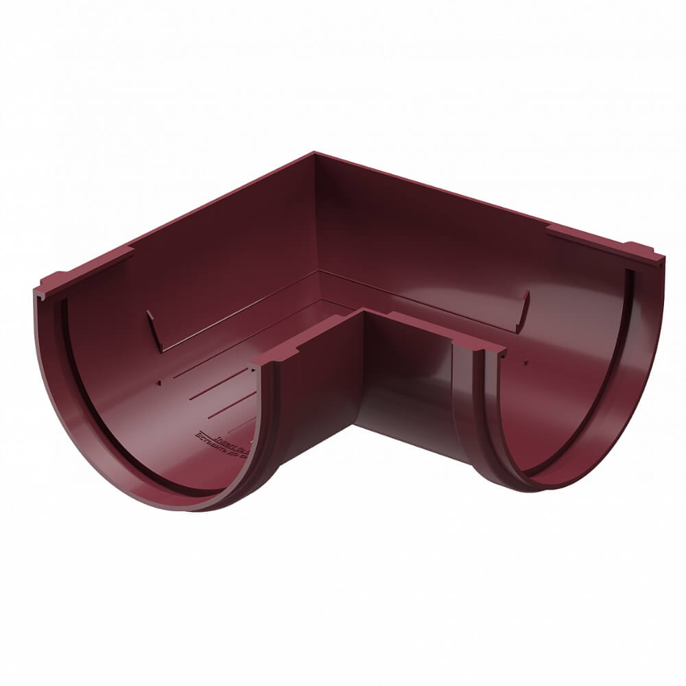Угловой элемент желоба универсальный ДЕКЕ STANDARD d120мм 90 градусов цвет RAL 3005 Красный в Петропавловске-Камчатском. Угловые элементы устанавливаются как на внешних, так и на внутренних углах кровли и предназначены для соединения желобов.