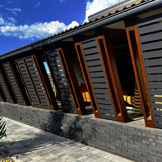 Для оформления стенок беседки был использован стильный и практичный вариант — ламели металлопланкена в покрытии RoofTop Бархат, выполненные в цвете RAL7024 Серый Графит. Такой декор не только подчеркивает современный архитектурный стиль объекта, но и обеспечивает надежную защиту покрытия от атмосферных воздействий. Мягкая бархатистая текстура и глубокий графитовый цвет придают конструкции выразительность, создавая гармоничное сочетание с природным окружением и другими элементами ландшафтного дизайна.